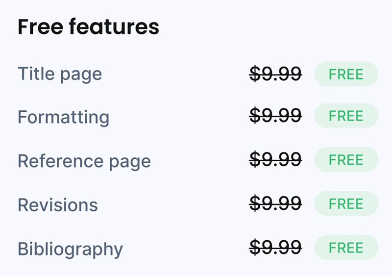 Some are more useful than others. Revisions, formatting, and the reference page matter the most. Things like email delivery or the title page are nice additions, but they are not the reason to choose the service.