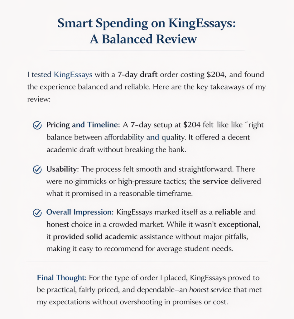 For the type of order I tested, KingEssays came out looking good, honest, and easy to recommend with small reservations rather than big warnings. The 7-day setup at $204 felt like the sweet spot. That is where the service looked the most attractive: not as a flashy promise, but as a practical, fairly priced academic support option that stayed comfortable to use from start to finish.